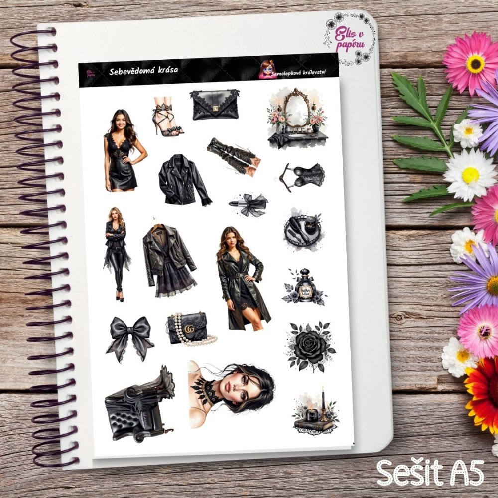 Najdeš tu 19 samolepek s motivy černých šatů, kabelek, podpatků, krajek, parfémů i stylových portrétů žen. Vše v elegantní tmavé paletě s nádechem luxusu a osobního výrazu. Samolepky jsou ideální do diáře, scrapbooku i jako součást moodboardu. Připomínají, že tvůj styl může být i součástí tvého plánování.