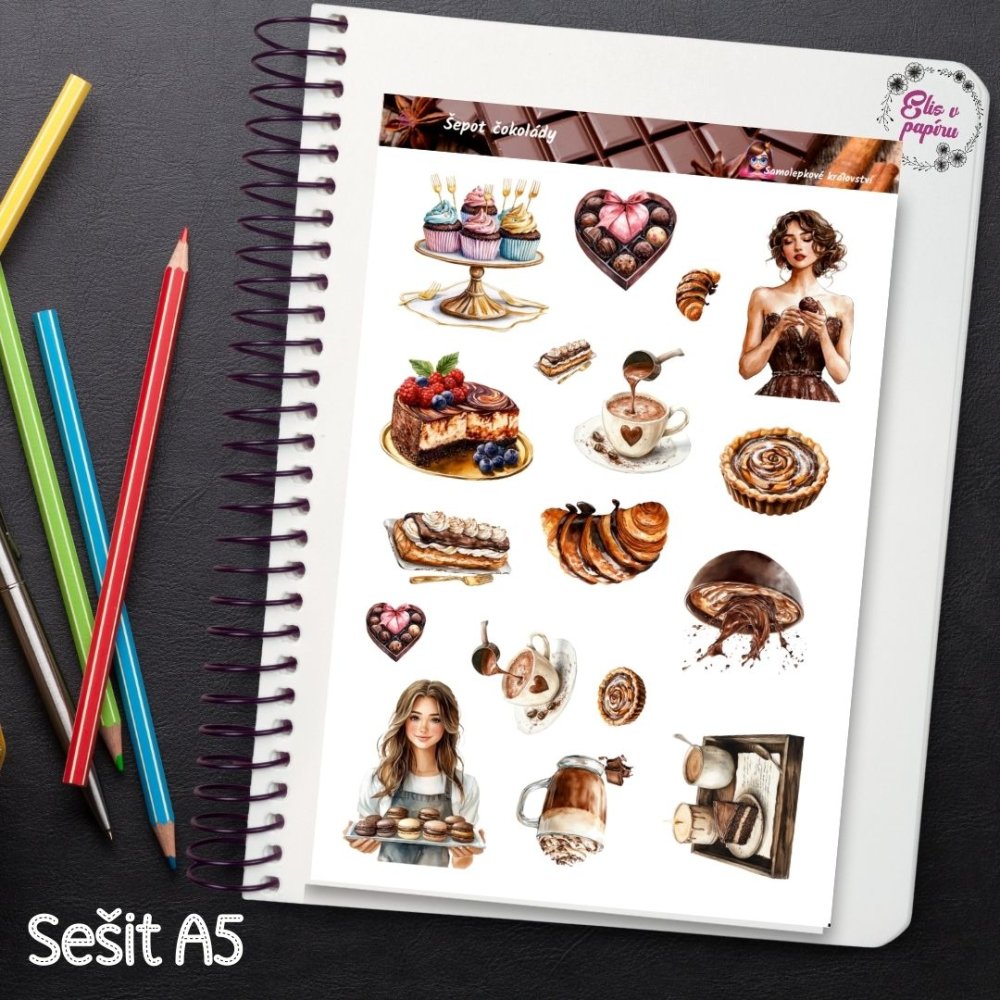 „Šepot čokolády“ je aršík plný voňavých dezertů, cupcaků, pralinek a šálků horké čokolády. Ilustrace v jemných hnědých a krémových tónech působí lákavě a hřejivě – přesně jako chvíle v oblíbené kavárně. Najdeš tu i kousky dortů, croissanty, makronky i úsměv servírky, která ti je přináší. Tyhle samolepky do diáře nebo scrapbooku jsou jako pozvánka dopřát si drobné radosti každý den.