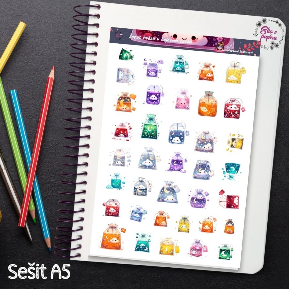 Celkem 37 samolepek s motivy čajových sáčků v různých barvách a stylech – s hvězdičkami, zvířátky i roztomilými detaily. Barevná paleta zahrnuje celou duhu – od jemné růžové po temně modrou. Tyhle české samolepky si tě získají svou roztomilostí a fantazií.