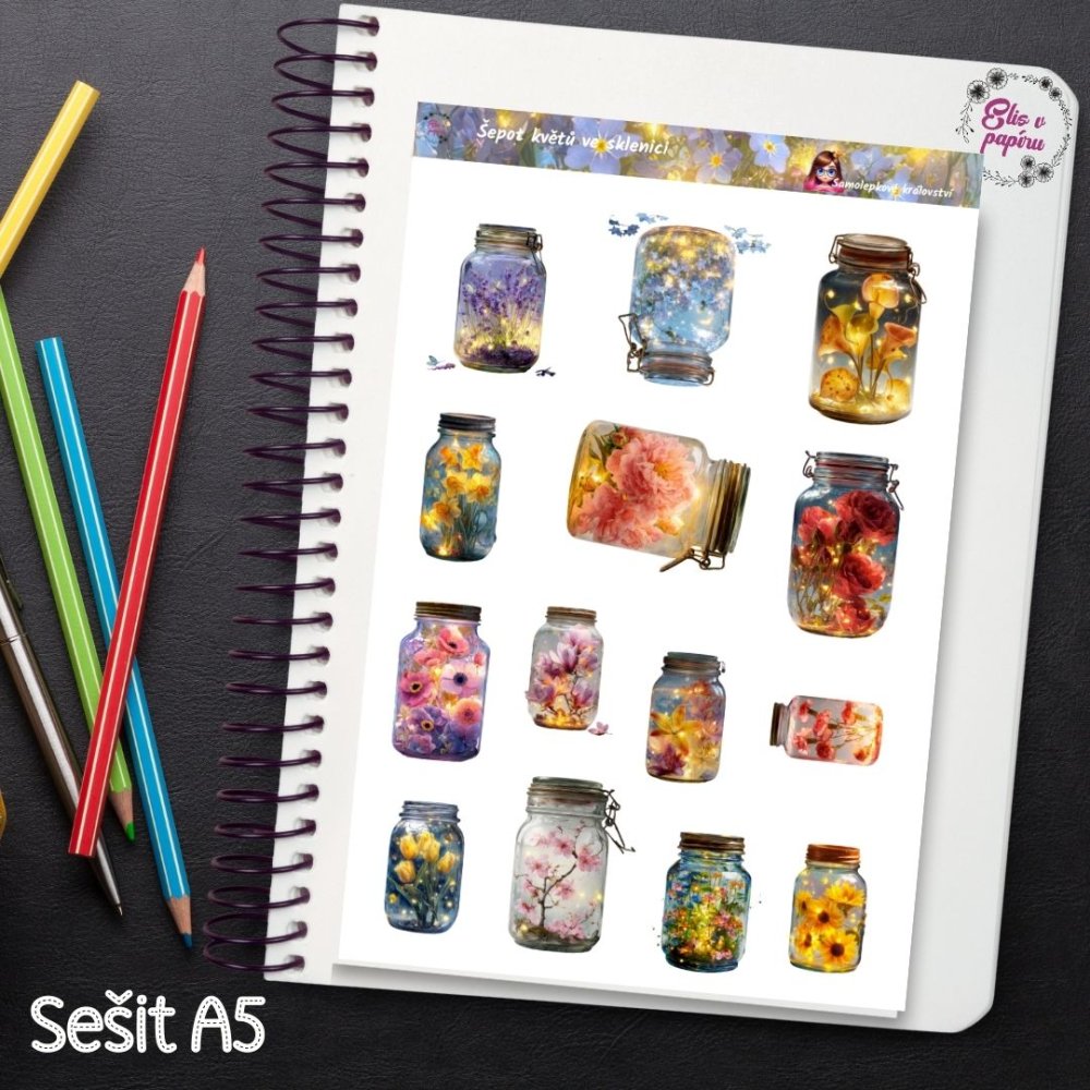 „Šepot květů ve sklenici“ je aršík plný jemných ilustrací sklenic, které ukrývají květy, světýlka i kousek hvězdné magie. Každá samolepka působí jako malá sbírka vzpomínek – od rozkvetlé louky přes sakurové větvičky až po tajemnou noční zahradu. Barevná paleta je pestrá, ale harmonická – převládají růžové, modré, žluté a zlatavé tóny. Tyhle samolepky do diáře vnesou do tvého plánování poetiku a klid, který budeš chtít uchovat.