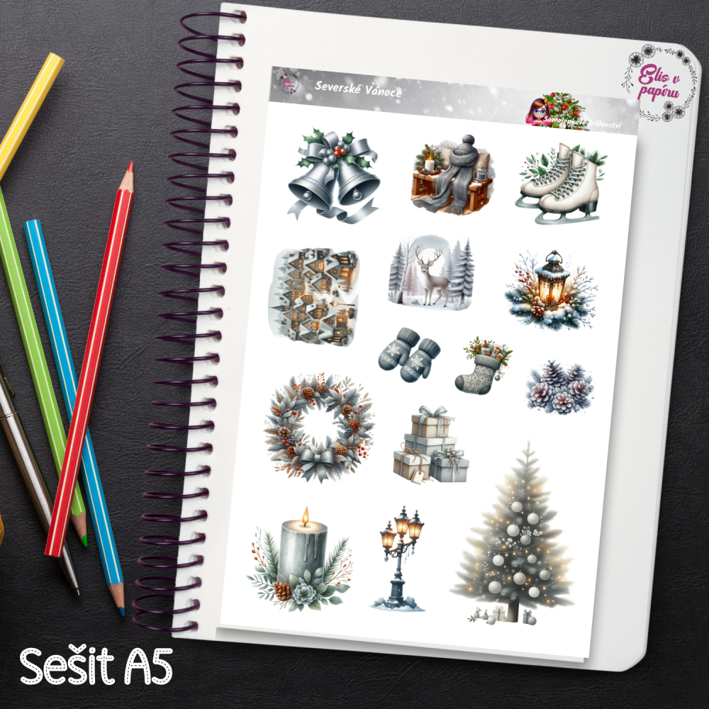 Najdeš tu 14 samolepek – vánoční stromek, věnce, svíčku, brusle, dárečky, lucernu, pletené detaily, zimní ponožky, sněžného soba, rukavice a další jemné prvky. Styl je akvarelový a realistický, laděný do tlumených odstínů s nádechem severské čistoty. Papírové samolepky krásně doplní zimní stránky bez přemíry barev.