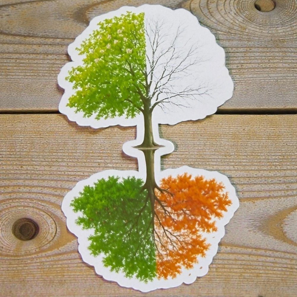 Tenhle strom mi připomíná, že všechno má svůj čas 🍃🍁. Miluju tu zrcadlovou kompozici – jako kdyby jaro hledělo do očí zimě a léto si podávalo ruku s podzimem. Když ho nalepím do deníku, vždycky mě zastaví a přiměje nadechnout. Používám ho hlavně na přelomu období – kalendářních i životních. Je jako kotva, která ti řekne: „Takhle je to v pořádku.“ Zkus si ho nalepit tam, kde potřebuješ připomenout, že i pauza je součást růstu.