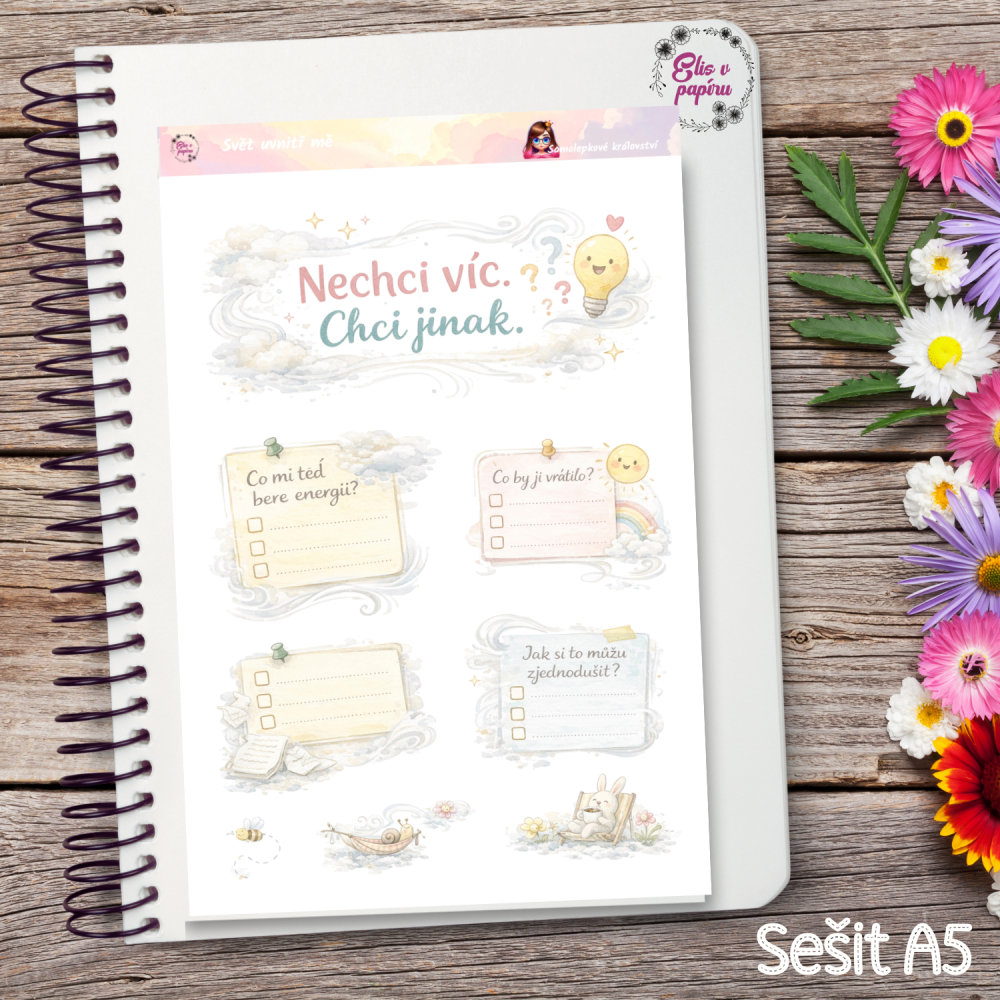 Aršík Nechci víc. Chci jinak. je jemným papírovým průvodcem na cestě zpět k sobě. Obsahuje 8 samolepek s ilustracemi a otázkami, které ti pomůžou zastavit se a uvidět, co ti teď bere energii – a co by ti ji mohlo vrátit. Každá samolepka vytváří prostor k zamyšlení: Co mi bere energii?, Jak si to můžu zjednodušit?, Co by ji vrátilo?. Barevnost je měkká, pastelová, s hravými detaily jako balónky, králíček, mraky a duhy. Ideální pro dny, kdy nechceš víc – jen jinak.