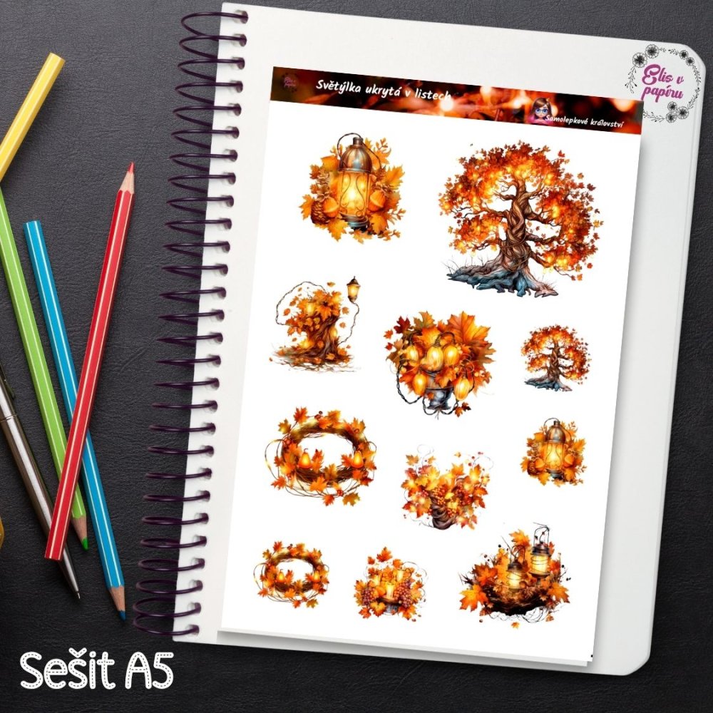 Najdeš tu 11 samolepek s motivy luceren, stromů, věnců a světýlek ukrytých v listí. Kombinace jemného světla a bohatých podzimních tónů dává aršíku snovou a klidnou atmosféru. Ilustrace jsou detailní, hřejivé a krásně doplní každé tvoření. Samolepky jsou ideální pro journaling i diářové plánování, kde hledáš víc než jen ozdobu.