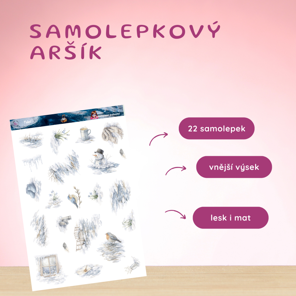 Miluju ten moment, kdy se sníh mění ve vodu, ale jaro je ještě pořád daleko. Kdy zima ukazuje svoji jemnější tvář – trochu rozcuchanou, mokrou, plnou loužiček a kluzkých cest. Aršík Tání jsem vytvořila právě pro tyhle dny. Lepím si ho, když mám chuť být víc uvnitř sebe a dát prostor přechodům – mezi ročními dobami, myšlenkami, fázemi. Nejradši používám rampouchy a první kvítky – jsou jako něžná připomínka, že i proměna má svoje kouzlo. Zkus si s nimi nalepit vlastní kapku ticha. 💧
