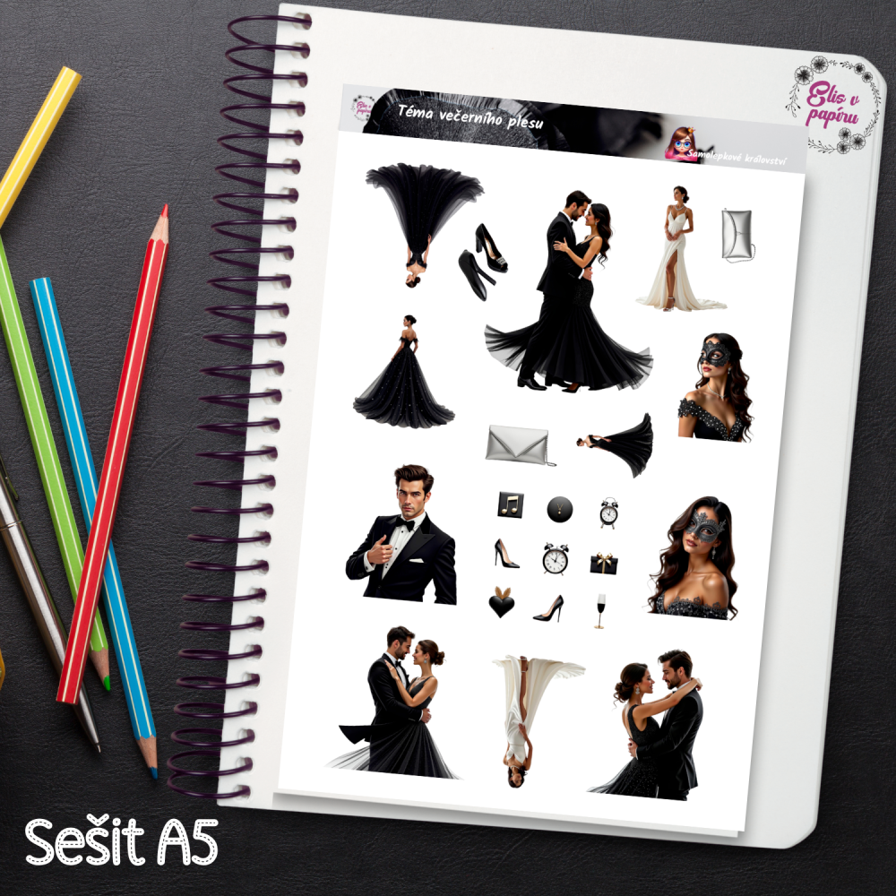 Najdeš tu 23 samolepek – ženy v plesových šatech, muže ve smokingu, tančící páry, šampaňské, hodinky, dopisy, lodičky, šperky i škrabošky. Styl je realistický, módní a velmi elegantní. Motivy jsou laděné do večerní černé s jemnými záblesky luxusu.