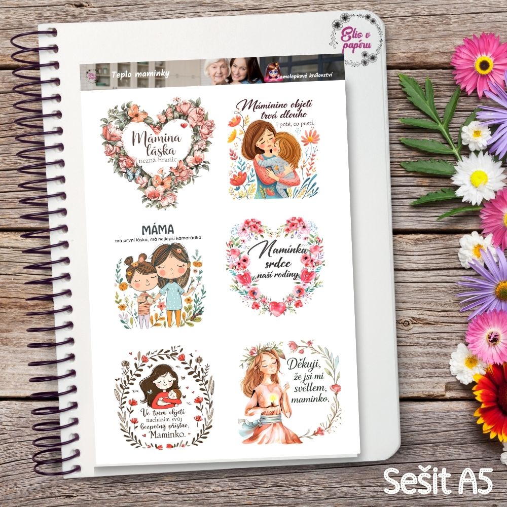 Tenhle aršík je pro mě hodně osobní a dojemný. Připomíná mi všechna ta objetí, která umí zahnat strach i smutek. Když se na něj dívám, cítím vděčnost za ty malé i velké momenty lásky. Tyhle samolepky do diáře si lepím do dnů, kdy chci poděkovat – sobě, životu nebo právě mamince. Jsou plné něhy, květin a slov, která mají hloubku. Každý motiv vypráví malý příběh o blízkosti a bezpečí. Pokud chceš do svého diáře dostat emoci, tenhle aršík tě chytne za srdce. 💕