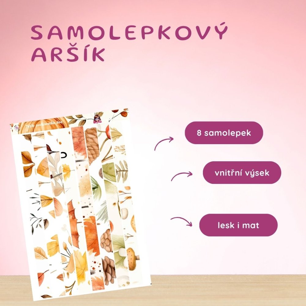 Aršík obsahuje 8 podlouhlých samolepek (cca 14,5 × 1 cm) s ilustracemi různých listů, hub, větviček a přírodních textur. Styl je akvarelový, jemný a vzdušný. Barvy ladí do podzimních tónů a dodávají stránkám v diáři přirozenou eleganci a klidnou krásu. Díky tvaru se skvěle hodí jako horizontální i vertikální doplněk stránky.
