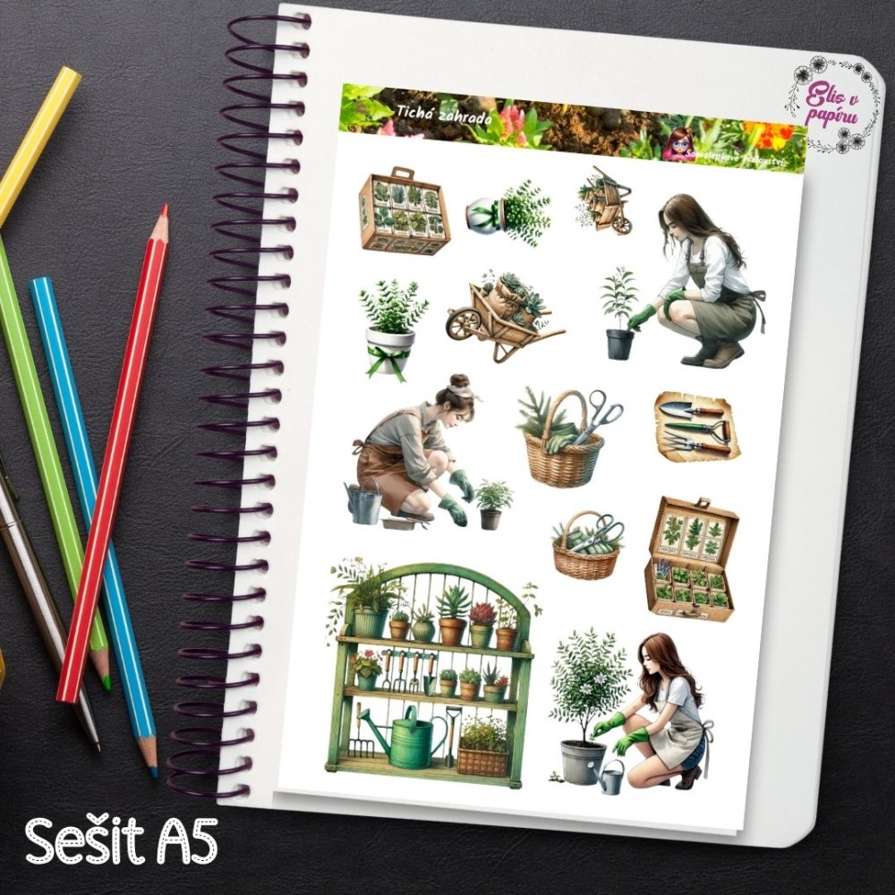 Když se mi hlava točí ze všech úkolů, vezmu si diář a tenhle aršík – a najednou mám pocit, že jsem na zahradě 🌱. Miluju ty chvíle, kdy lepidlo voní jako hlína a samolepky vypadají, jako by právě vykoukly z truhlíku. Nejradši lepím košíky s nářadím a malé sazenice do dnů, kdy si plánuji volno. Připomínají mi, že je v pořádku růst pomalu a podle svého tempa. Věř mi – i tvoje stránky můžou rozkvést tak, že se do nich budeš chtít vracet. 🌿