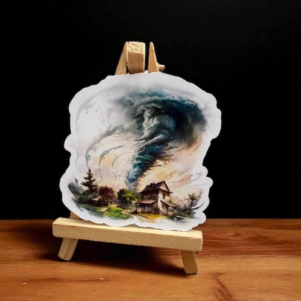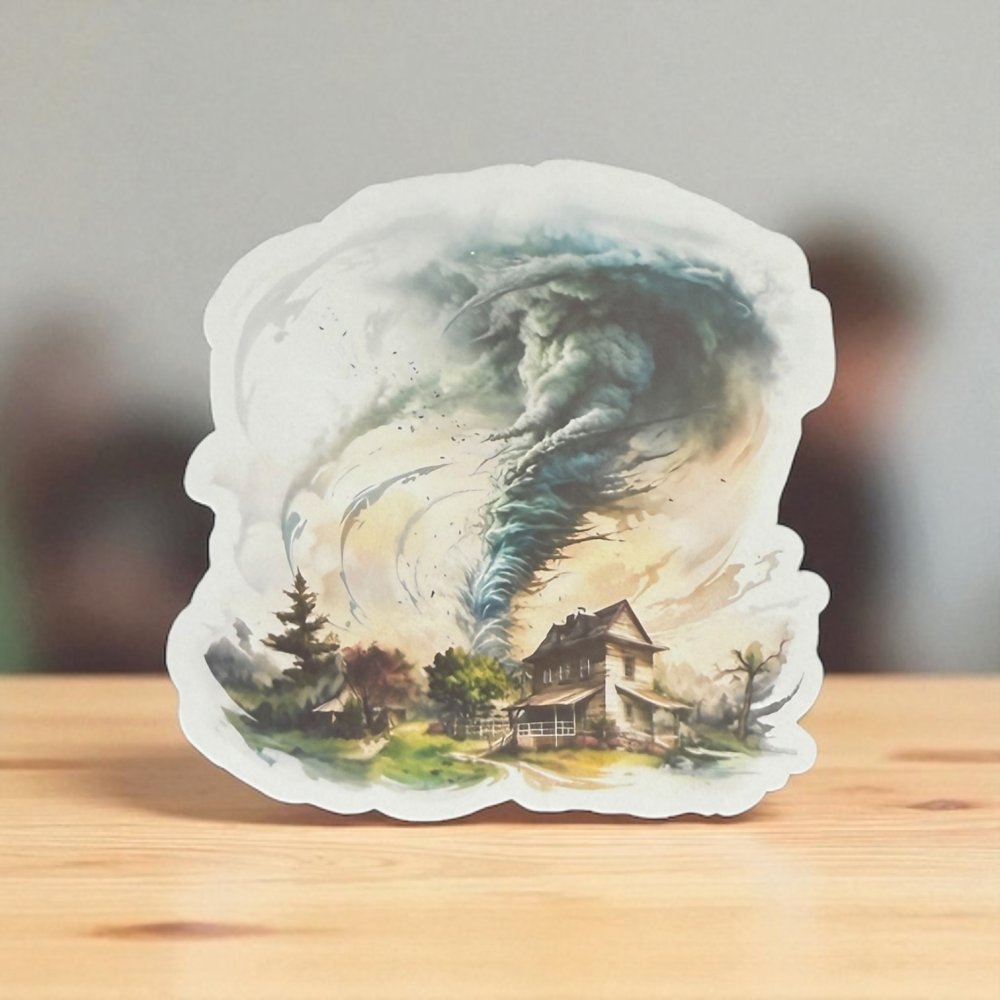 Detailní ilustrace tornáda, které se stáčí k venkovskému domu obklopenému stromy. Barvy přecházejí od jemně kouřových tónů k jasným odstínům zelené a hnědé. Samolepka působí realisticky a přitom má malířskou atmosféru – ideální pro výrazný prvek v plánovači či albu.