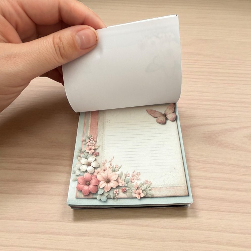 Víš, co na motýlech miluju nejvíc? Že nikdy nelétají podle přímé čáry 🦋. Připomínají mi, že i naše myšlenky a cesty se můžou klikatit – a přesto být krásné. Tenhle bloček mám vždycky na stole, ať už si píšu nákupní seznam, nebo nápad na novou kapitolu do deníku. Často si z něj vytrhnu stránku, přidám malý vzkaz a přilepím ho na lednici nebo do diáře. Motýli mi pokaždé vykouzlí úsměv a připomenou, že každé slovo může někomu rozzářit den. Zkus to taky – a uvidíš, jak se radost šíří. 🌸