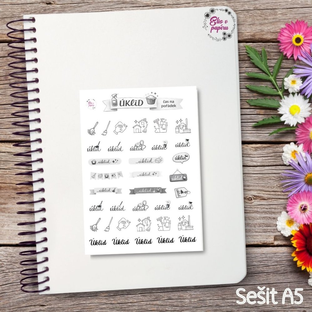 Aršík Úklid obsahuje 37 samolepek s nápisem „úklid“ v různých stylech a doplněné o jemné ikonky – mop, koště, rukavice, domeček, vysavač, kbelík, čisticí prostředky nebo jednoduché cedulky. Samolepky jsou v decentní černobílé, takže se hodí do jakéhokoliv typu diáře, plánovače i bullet journalu.