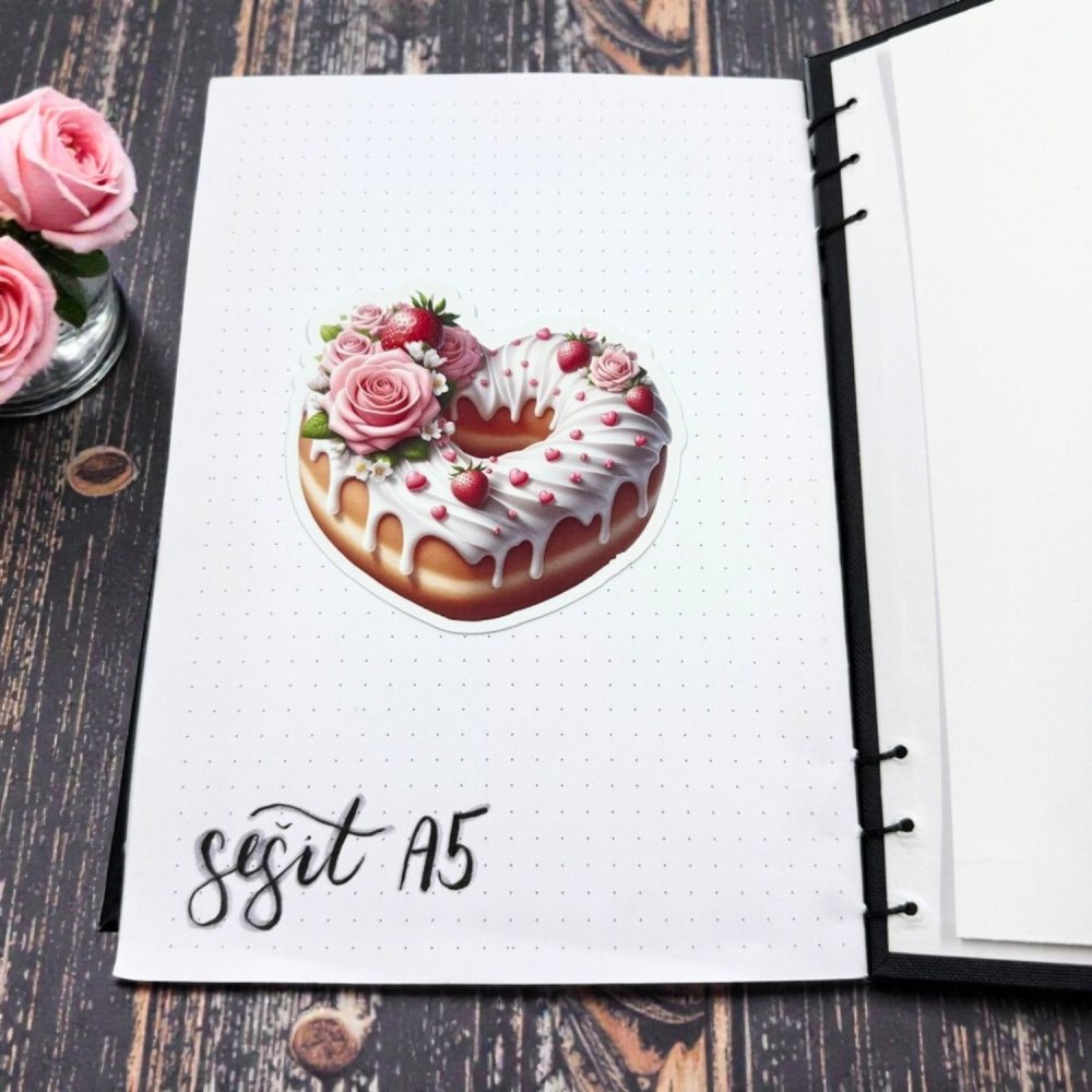 Valentýnský donut je maxikusová papírová samolepka ve tvaru srdce, zdobená růžemi, jahodami a drobnými srdíčky. Poleva jemně stéká a vytváří chuťově i vizuálně lákavý motiv. Barevnost je laděná do růžových, krémových a červených tónů, které působí romanticky a hravě. Samolepka vyzařuje radost, lásku a lehkost. Díky většímu formátu se stane dominantou stránky a okamžitě přitáhne pozornost. Ideální pro valentýnský journaling, scrapbook i radostné plánování.
