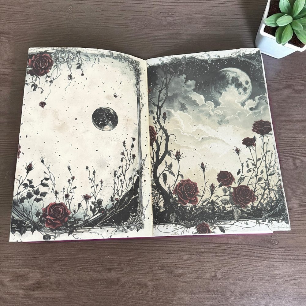 Vintage sešit Gotická růže tě zavede do světa, kde je psaní rituálem. Vnější obal zdobí měsíc na tmavé obloze a rudé růže, které se plazí jako vzpomínky mezi větvemi. Uvnitř pokračuje kouzlo – ilustrace růží, gotických rámečků, tajemných ozdob a jemné patiny dávají každé stránce atmosféru deníku z jiného času. Je to sešit pro duši, co miluje krásu i hloubku.