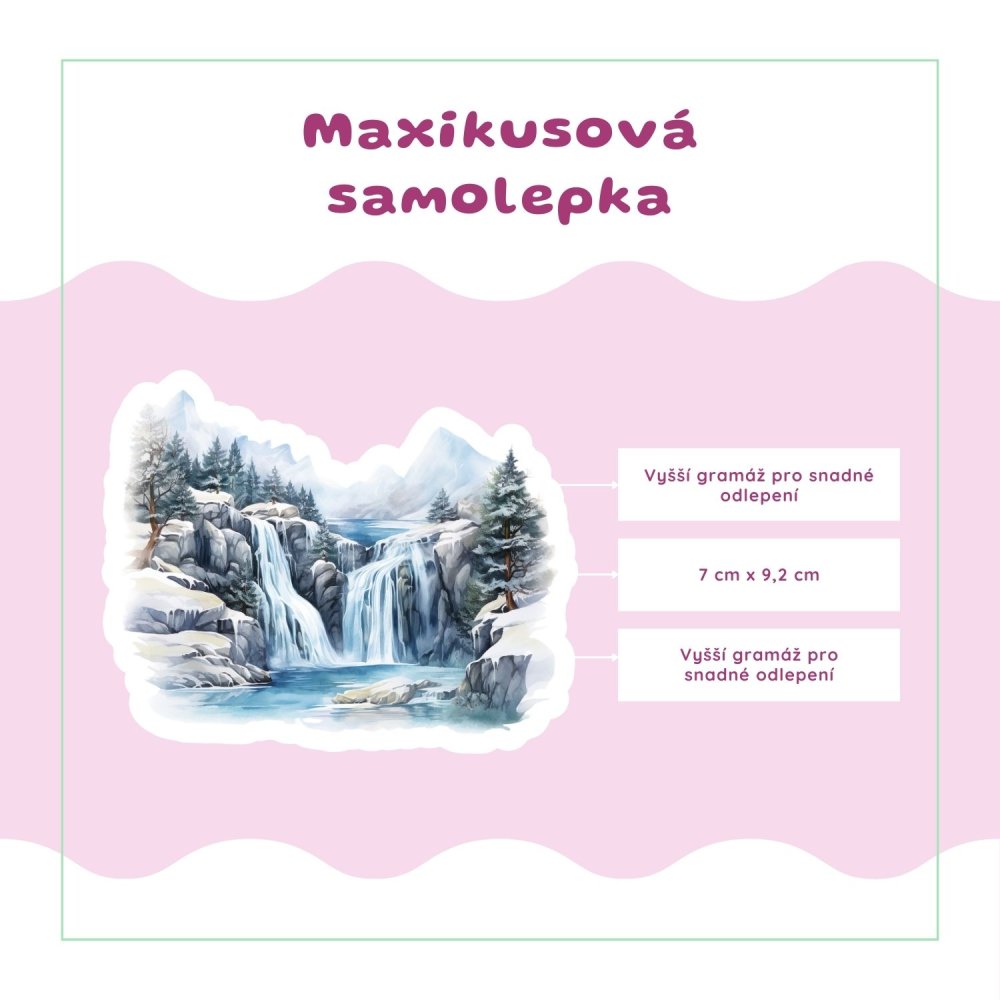 Detailní ilustraci zimního vodopádu v horském prostředí. Skály, sníh, voda a stromy vytvářejí harmonickou, lehce snovou scénu. Samolepka má bílý okraj a krásně vynikne na světlém i tmavším podkladu.