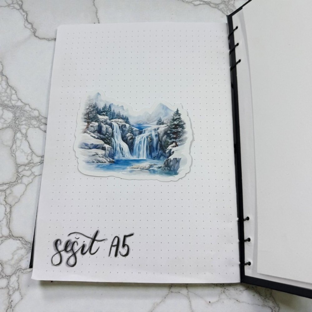 Vodopád uprostřed zimy je maxikusová papírová samolepka s ilustrací horského vodopádu obklopeného sněhem, skalami a jehličnany. Chladná barevná paleta v modrých, šedých a bílých tónech působí klidně a čistě. Motiv symbolizuje plynutí, sílu a vnitřní rovnováhu. Díky většímu formátu se stane dominantou každé stránky. Ideální pro pomalý journaling, scrapbook i tiché plánování.