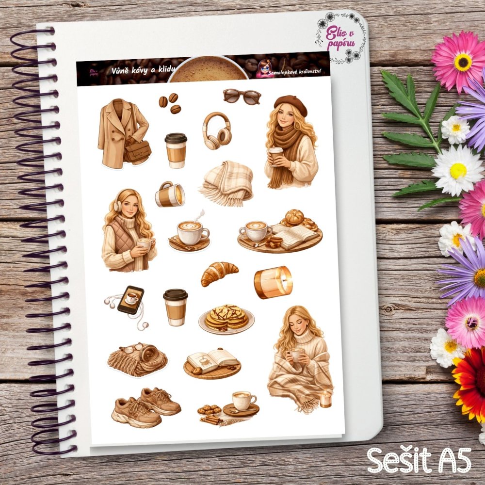 Aršík obsahuje ilustrace kávy, hrnků, svíček, knih, croissantů, sladkostí, oblečení a cozy detailů. Styl je realistický, hřejivý a velmi příjemný. Samolepky se krásně kombinují s podzimními a klidovými aršíky. Jsou to české samolepky ideální do diáře i bujo.