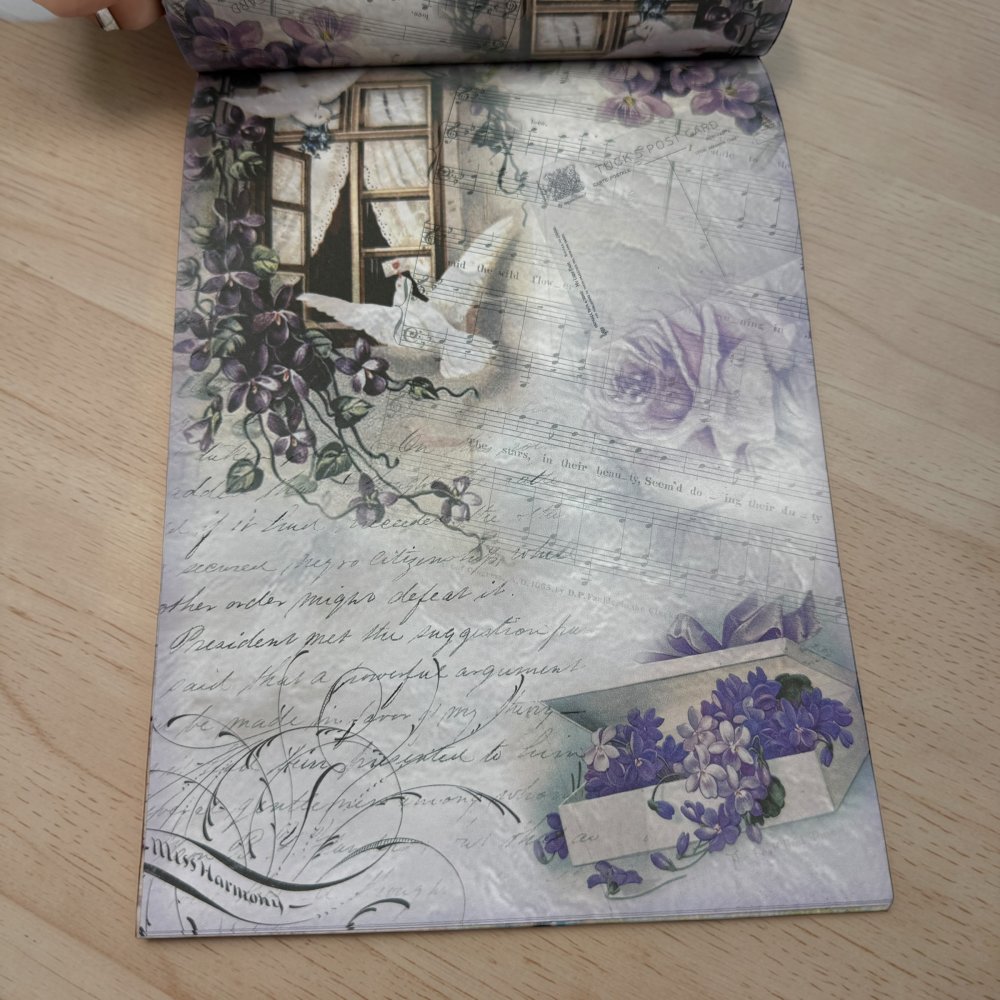 Dopisní papíry s vintage ilustracemi kombinujícími květiny, ptáky, noty a rukopisné texty. Každý motiv vytváří jemnou nostalgickou atmosféru pro ruční psaní.