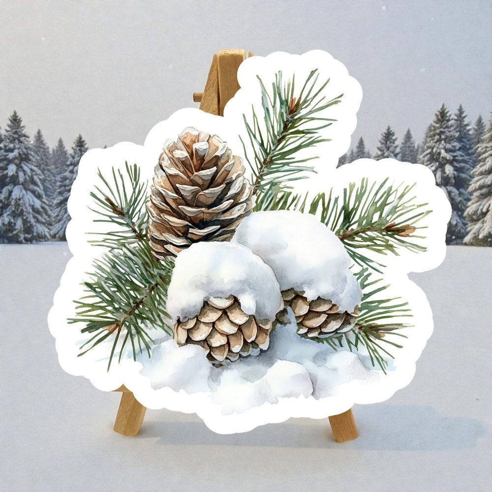 Maxikusuová samolepka „Zasněžené šišky“ zobrazuje detail větviček s borovými šiškami, na kterých leží měkký bílý sníh. Jemná zimní akvarelová ilustrace přináší do tvého zápisníku ticho lesa, přirozený rytmus přírody a vizuální poetiku zimní sezóny.