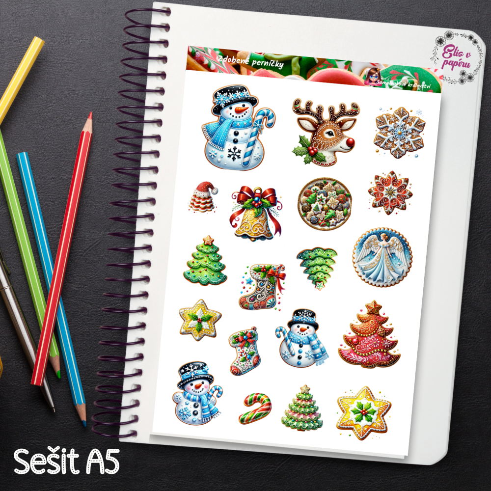 Pečení perníčků je pro mě každoroční radost, a tenhle aršík je taková jeho papírová verze 🍪. Vybírala jsem motivy, které připomínají dětskou radost, barvy cukrové polevy a vůni skořice ve vzduchu. Mám je ráda na prosincové víkendy, kdy si plánuju pečení nebo si jen užívám vánoční tvoření. Nejvíc mě baví ten detail – sněhuláci, stromečky, andílek… prostě samá dobrota pro oči. Zkus si nalepit perníčkovou náladu i do svého diáře! 🎄