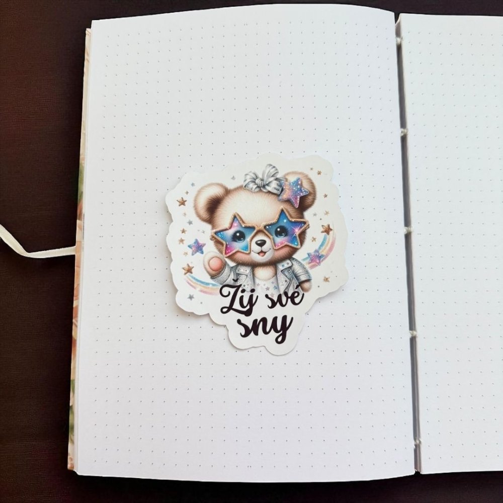Jednu velkou papírovou samolepku s medvídkem v hvězdných brýlích a nápisem Žij své sny. Ilustrace je hravá, barevná a roztomilá – ideální pro ty, kdo milují pozitivní energii a malé připomínky odvahy.