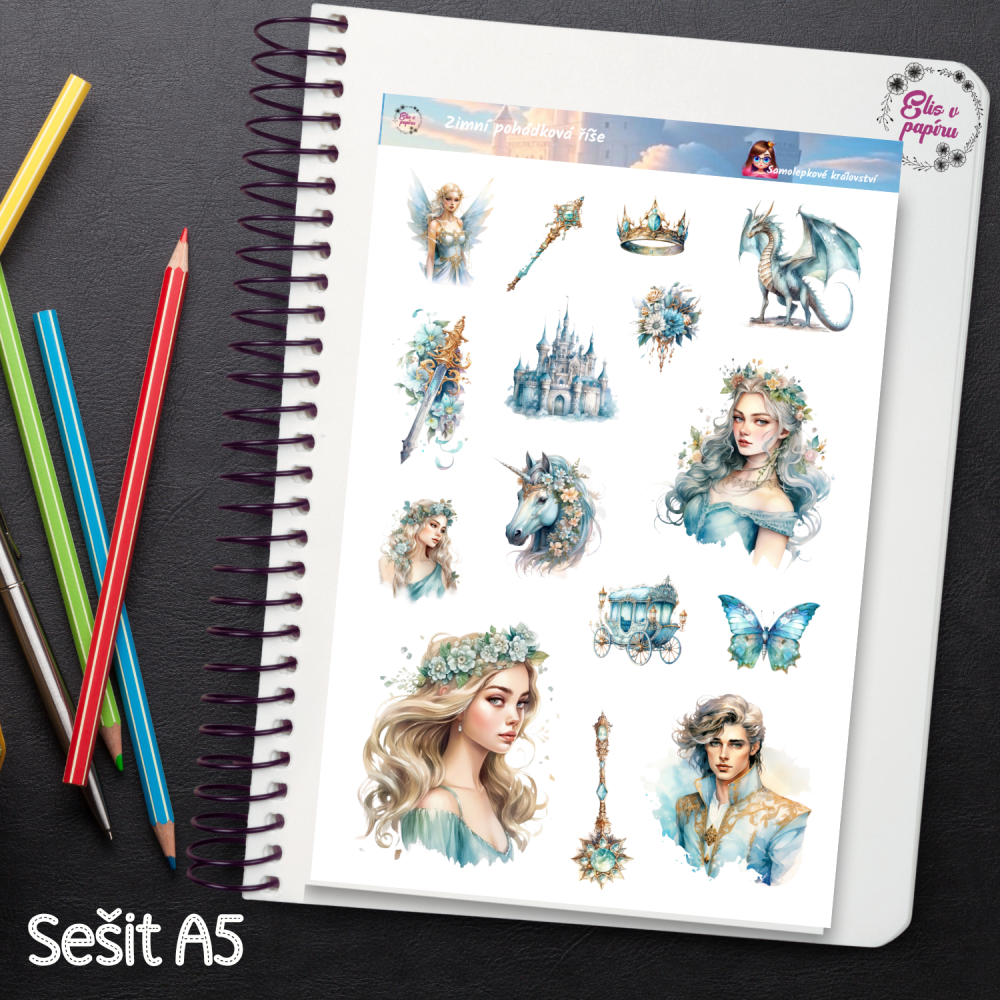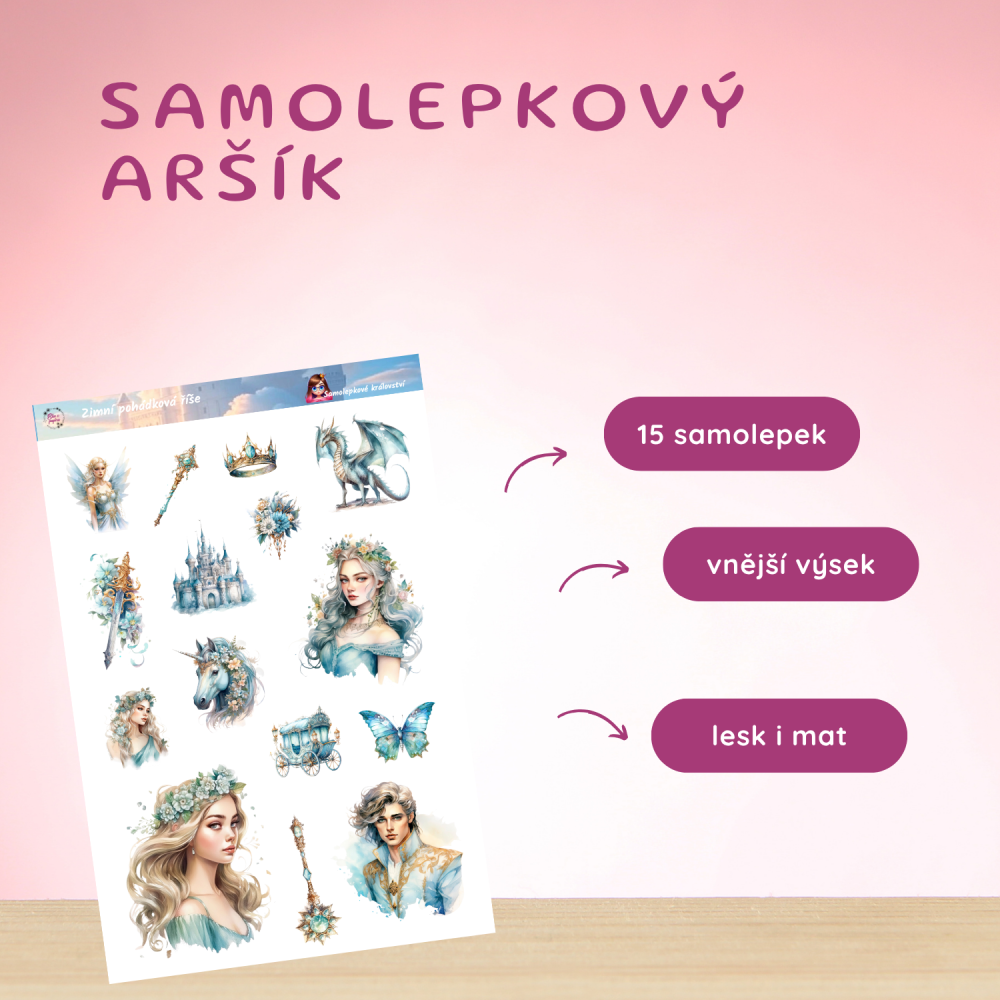 15 samolepek s motivy zimního fantasy světa – víla, princezna, princ, drak, jednorožec, zámek, koruna, hůlka i kouzelný kočár. Ilustrace jsou detailní, laděné do jemných studených odstínů s pohádkovou atmosférou. Výsek je vnější, což zajišťuje snadné a čisté použití v plánování i journalingu.
