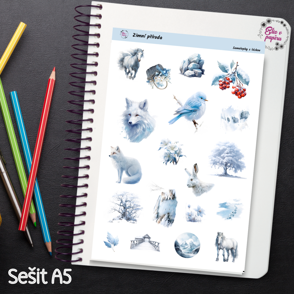 Najdeš tu 19 samolepek se zimními motivy – lišky, zajíce, modrého ptáčka, koně, zasněžené stromy, bobule, květy i horskou krajinu. Všechny ilustrace jsou jemné, detailní a mají akvarelový styl. Aršík ladí do chladivých tónů s přirozeným, ale kouzelným výrazem. Výsek je vnější, takže se samolepky krásně aplikují i do minimalistických rozvržení.